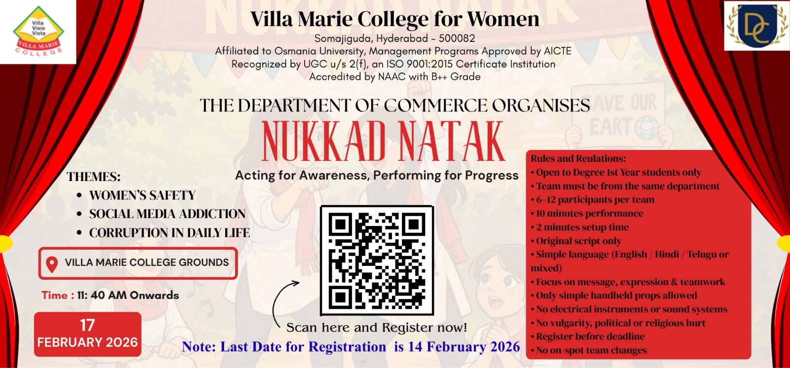 - 11th February 2026, Department of Commerce invites you to register for the Nukkad Natak competition and showcase your creativity while spreading awareness on social issues. Form your team, choose a theme, and participate to perform for a purpose and make an impact