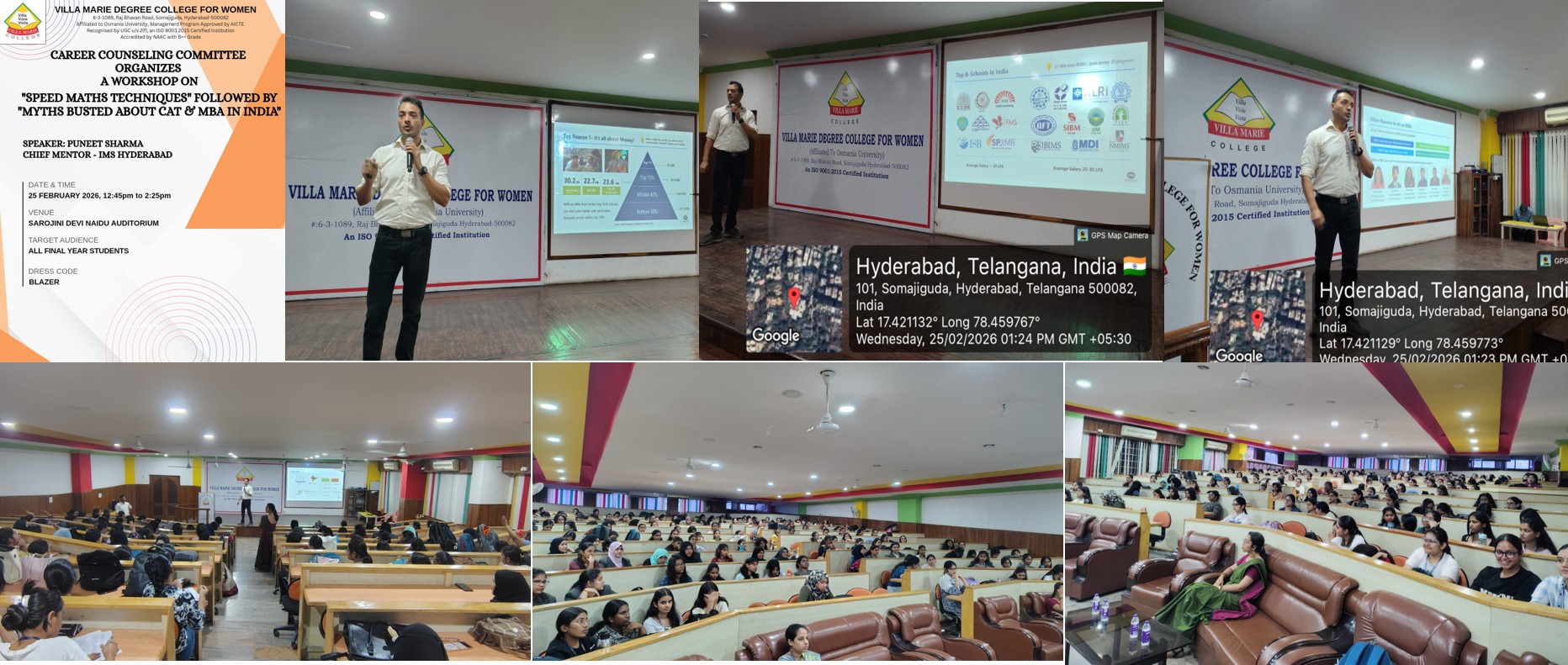 - 25th February 2026, Career Counseling Committee organized a workshop on “Speed Maths Techniques”, followed by an insightful session on “Myths Busted about CAT and MBA in India”, in association with IMS Hyderabad.