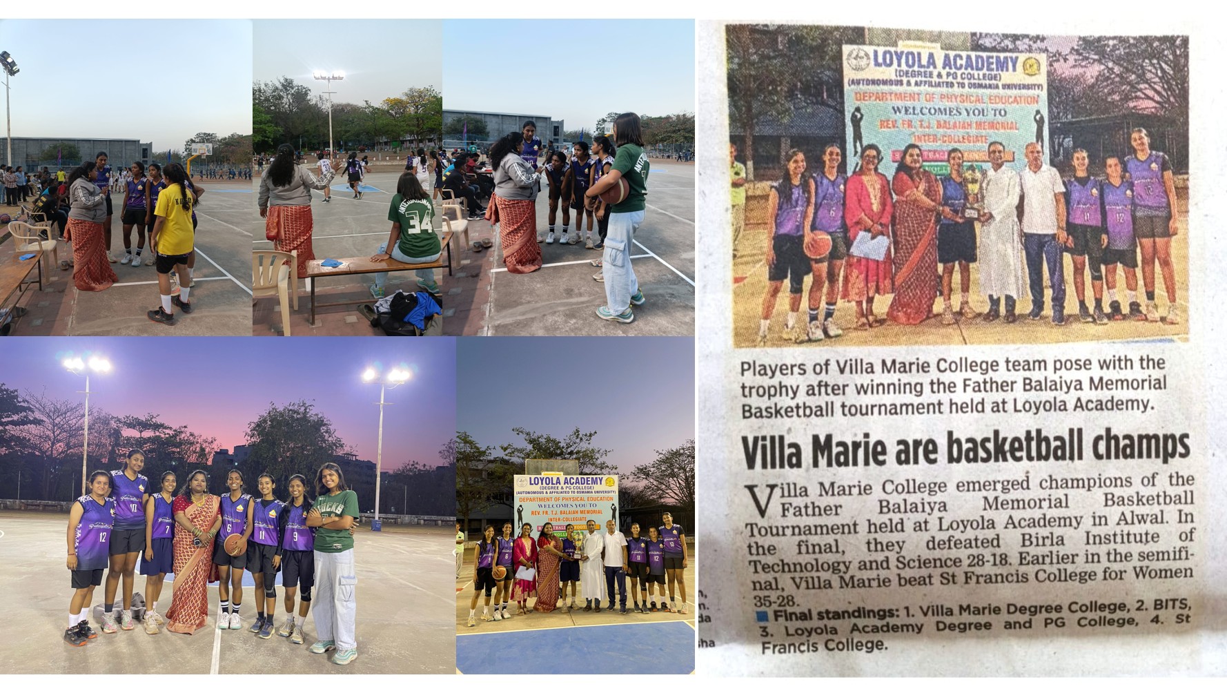 - 20th February 2026, Department of Physical Education proudly announces that our students clinched the championship title at the Fr. Balaiya Memorial Intercollegiate Basketball Tournament held at Loyola Academy. The team delivered an impressive performance, securing a 28–18 victory against BITS in the finals after defeating St. Francis College for Women in the semifinals